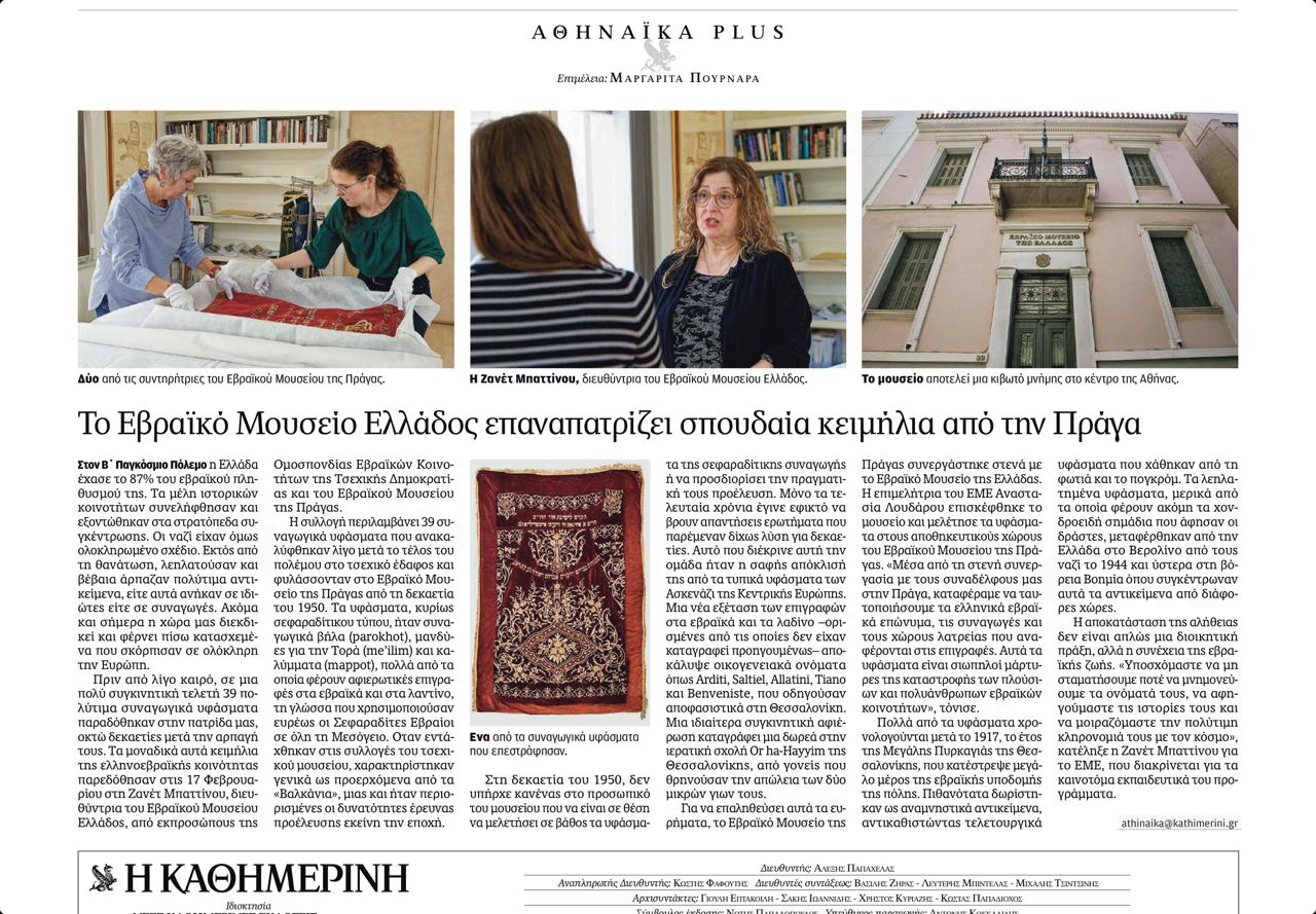 Kathimerini, hlavní řecký deník, reflektuje navrácení souboru sefardských textilií po 80 letech - březen 2026